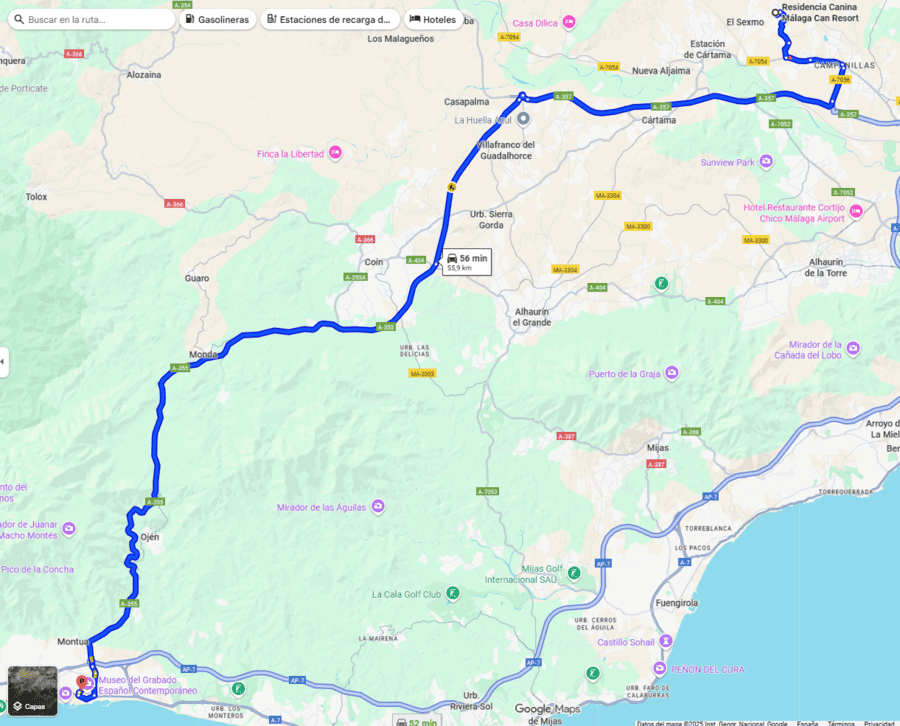 Nuestra residencia canina se encuentra cerca de Marbella (50 mtos aprox), exactamente en Camino Lo Cotta, 1, 29591 Santa Rosalía, Málaga.